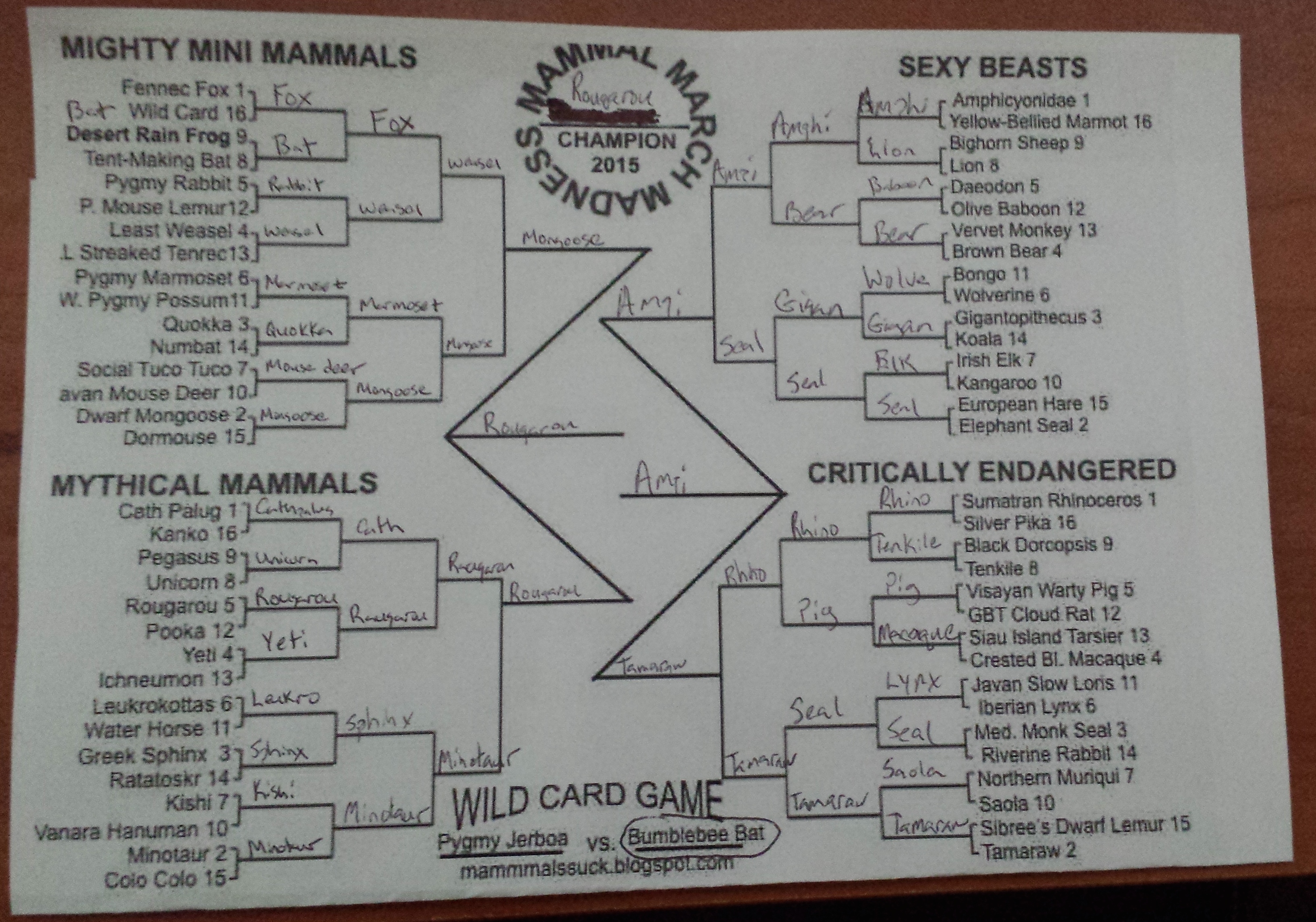 The Blois lab is gearing up for the 2015 edition of Mammal March Madness! We are so excited about this years competition. Last year, we participated as a lab group. This year, we’re ramping up the intra-lab competition and each filling out our own brackets. Entries so far are pretty consistent: Jessica, Kaitlin, and Sarah are all predicting that Amphicyonidae will be the champ, but Chris predicts that Cath Palug will win it all. I’m throwing in a TBD prize for the lab winner(s).